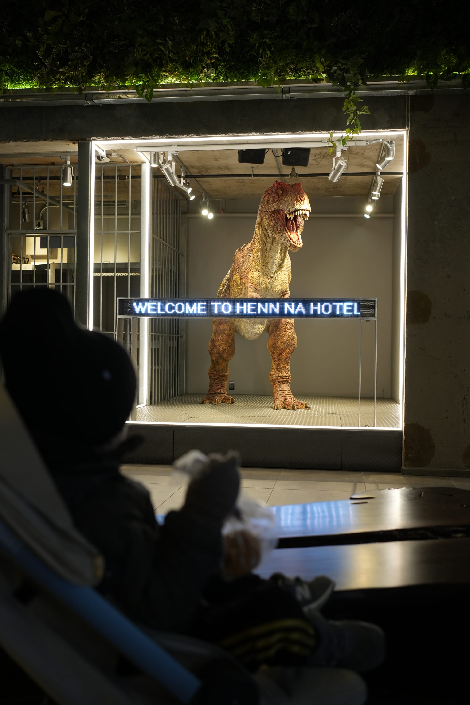 Snett-är-rätt-parkering, T-Rex istället för väskbärare och utsikten från vårt hotellrum