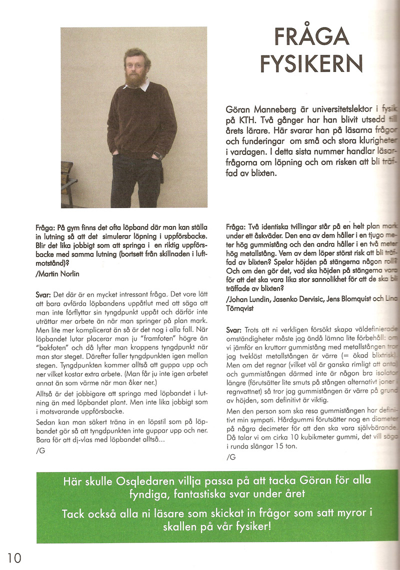 “Fråga: Två identiska tvillingar står på en helt plan mark under ett åskväder. Den ena av dem håller i en tjugo meter hög gummistång och den andra håller i en två meter hög metallstång. Vem av dem löper störst risk att bli träffad av blixten? Spelar höjden på stängerna någon roll? Om den gör det, vad ska höjden på stängerna vara för att det ska vara lika stor sannolikhet för att de ska bli träffade av blixten?*