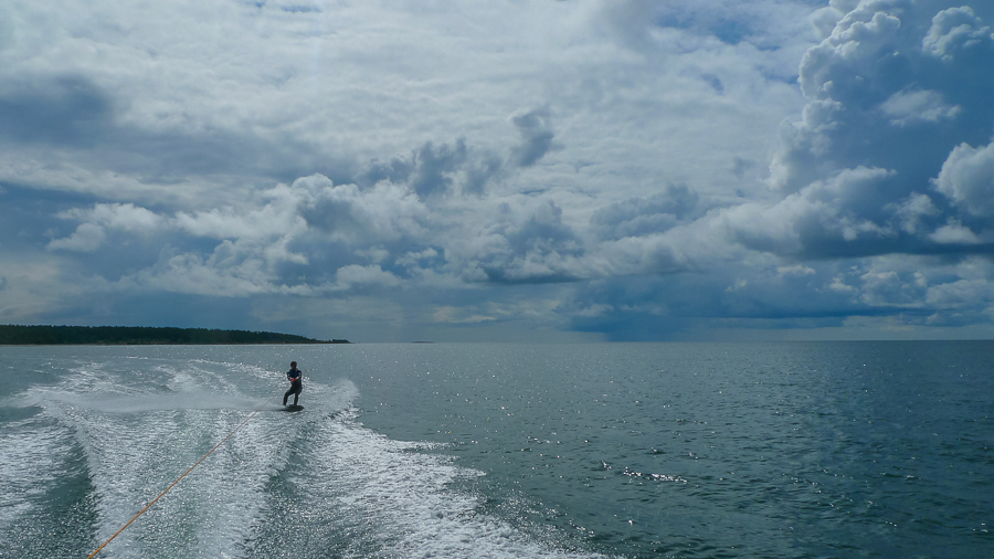 Vi åkte en hel del wakeboard och tränade lite på den ädla konsten att skapa ett avstånd mellan bräda och vatten, vilket är mer känt under namnet att hoppa. Det blev inga imponerade luftfärder, men vi lyckades lämna vattnet under korta stunder i alla fall.